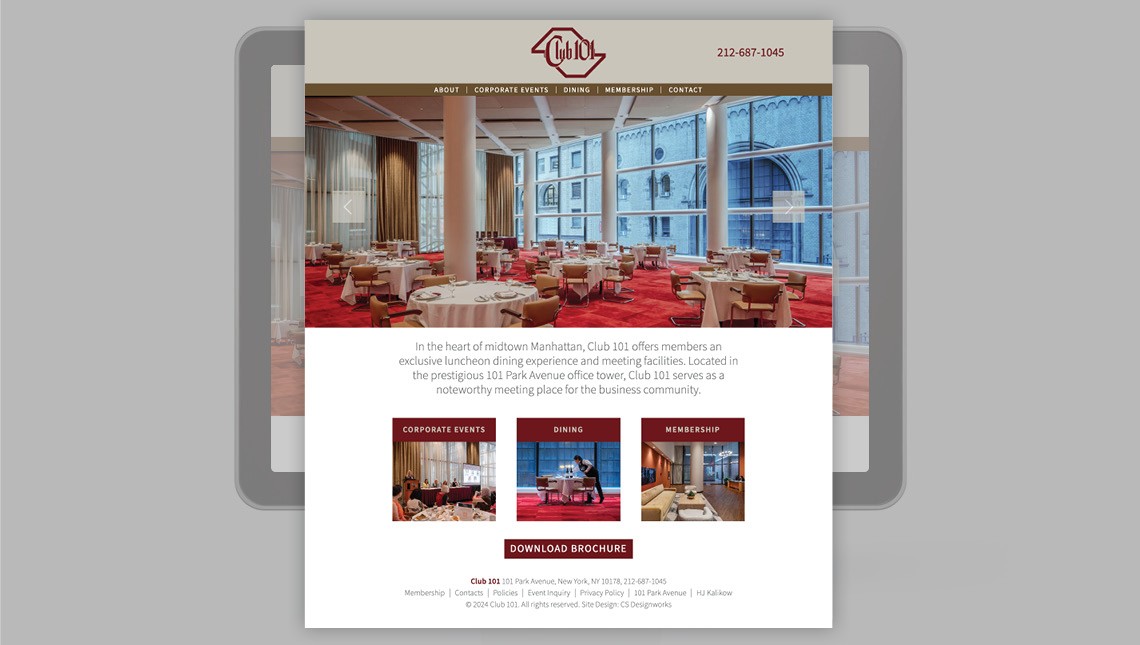 CS Designworks has been a trusted partner of HJ Kalikow for over 20 years, consistently delivering high-quality digital solutions that bring their properties to life. The Club 101 website is the latest example of this enduring partnership, and we’re thrilled to have created a platform that not only highlights the club’s premier event space but also enhances its visibility within New York’s corporate and social spheres.