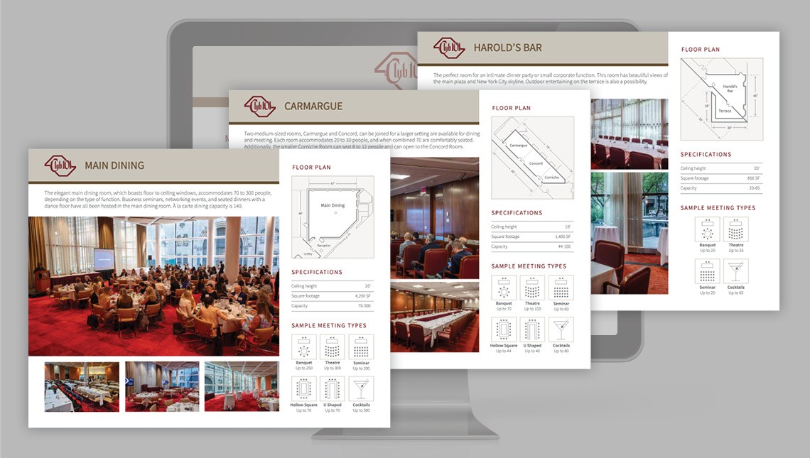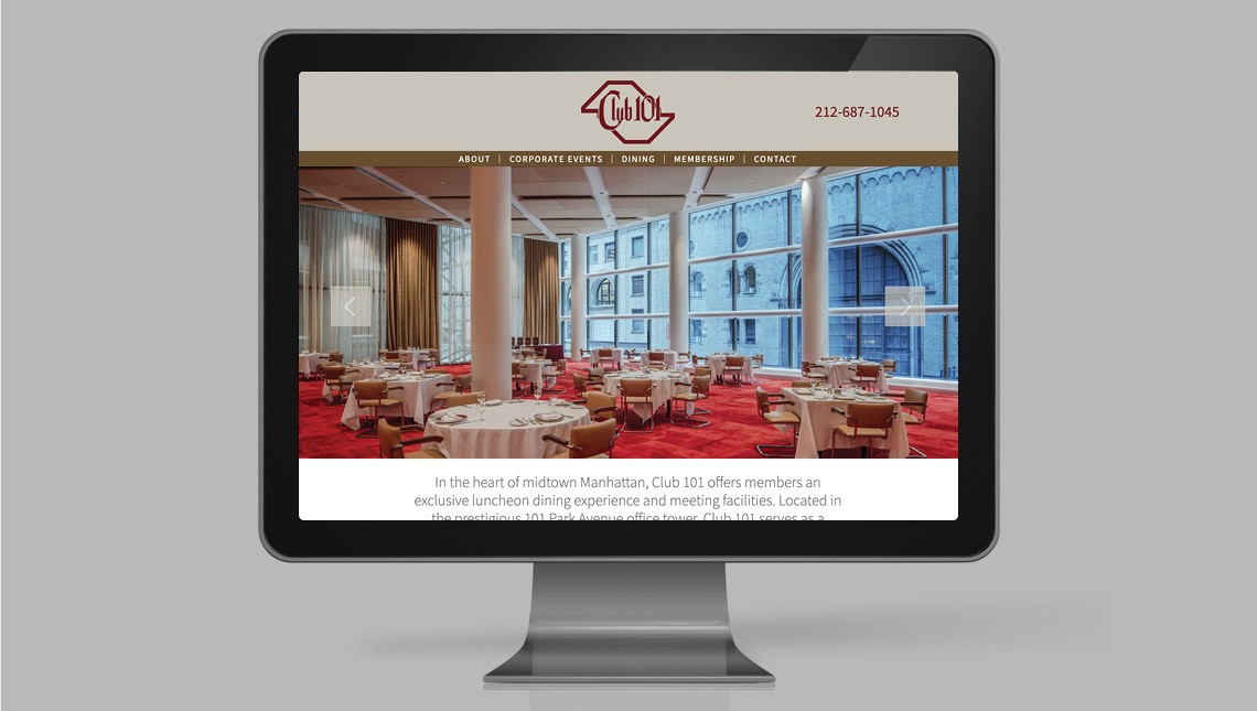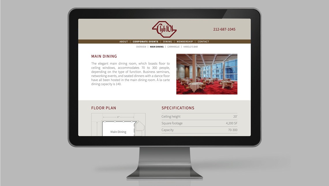 The primary objective of the website redesign was to promote Club 101's versatile event space, which, while highly exclusive, has often remained under the radar. Club 101’s 12,000 square feet of space, including twenty-foot-high ceilings and flexible layouts, can accommodate events of up to 300 guests. The venue features multiple breakout rooms, offering privacy and flexibility for meetings, luncheons, seminars, and larger gatherings.